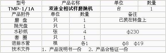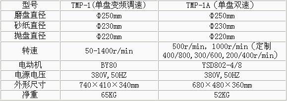 產(chǎn)品概述: TMP-1單盤雙速金相試樣磨拋機(jī) •澳大利亞科學(xué)家smeuls提出凡是用固定磨料(如砂輪片、砂輪和金剛石磨盤以及各種砂紙)制備試樣的過(guò)程稱為磨光,凡是使用松散磨料(如加入各種磨料微粉懸浮液、噴霧拋光劑、拋光膏)制備過(guò)程稱為拋光。 •單盤雙速磨拋機(jī)(拋盤、研磨盤)就能完成各種試樣的粗磨、細(xì)磨、干磨、濕磨、研磨及拋光等各道工序。 •該機(jī)的磨拋盤直徑均大于國(guó)內(nèi)同類產(chǎn)品,有效增加工作面20-30%有更多不同線速度的選擇。 •本機(jī)可選擇安裝PD-1型推移器,,能替代手工進(jìn)行磨拋各道工序。 TMP-1A無(wú)級(jí)變速金相試樣磨拋機(jī) •變頻調(diào)速,試驗(yàn)范圍自行設(shè)定。 •只需調(diào)換磨盤或拋盤和選擇合適轉(zhuǎn)速即可粗磨、細(xì)磨、干磨、濕磨、研磨及拋光等各道工序。 •傳動(dòng)功率、磨拋盤直徑均大于國(guó)內(nèi)同類產(chǎn)品,,可增加有效工作面20-30%,,可適應(yīng)不同材料的制備要求。 •本機(jī)可選擇安裝PD-1型推移器,能替代手工進(jìn)行磨拋各道工序。 技術(shù)參數(shù):