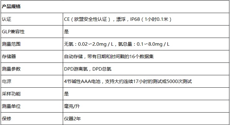 900測量儀的特點時可以快速準確地測量游離氯或總氯含量: •自動數據存儲功能;能夠存儲具有日期和時間標記的16個數據集 •大型背光LCD顯示屏 •IP68防水外殼;易于固定或放置在臺面上;可漂浮 •遮光罩,,可防止容易損壞或丟失的移動部件或單獨部件的移動 •用戶校準功能 •可以根據特定的范圍要求,,提高分辨率 •可以針對采樣過程對于已知的干擾進行調整 •自動關閉功能 •2年的保修期